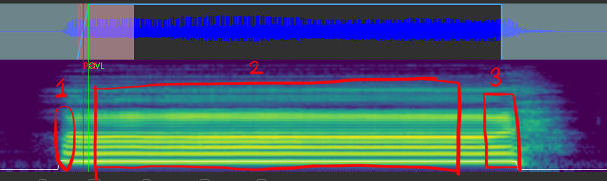 1: Beginning Vowel Transitions. Can be from a consonant to a vowel, or a vowel to another vowel.2: Flats. These are the areas where the 'lines' on the spectogram are most stable.3: Ending Vowel Transitions. The location where the flat lines 'destabilize' before going to the end of a note, towards a consonant, or towards another vowel.